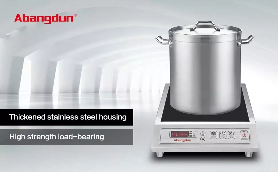 【UNIQUE STRUCTURE】This professional-grade commercial countertop burner features a unique design where the glass panel is positioned 2mm below the stainless steel housing, allowing the housing to support heavy cookware and prevent the glass panel from cracking due to excessive pressure. The working principle of the commercial countertop cooker is to heat the cookware itself, rather than the cooktop surface. Therefore, the cooktop can still function properly within a limited gap/partition.