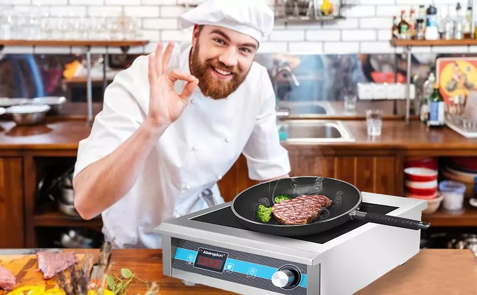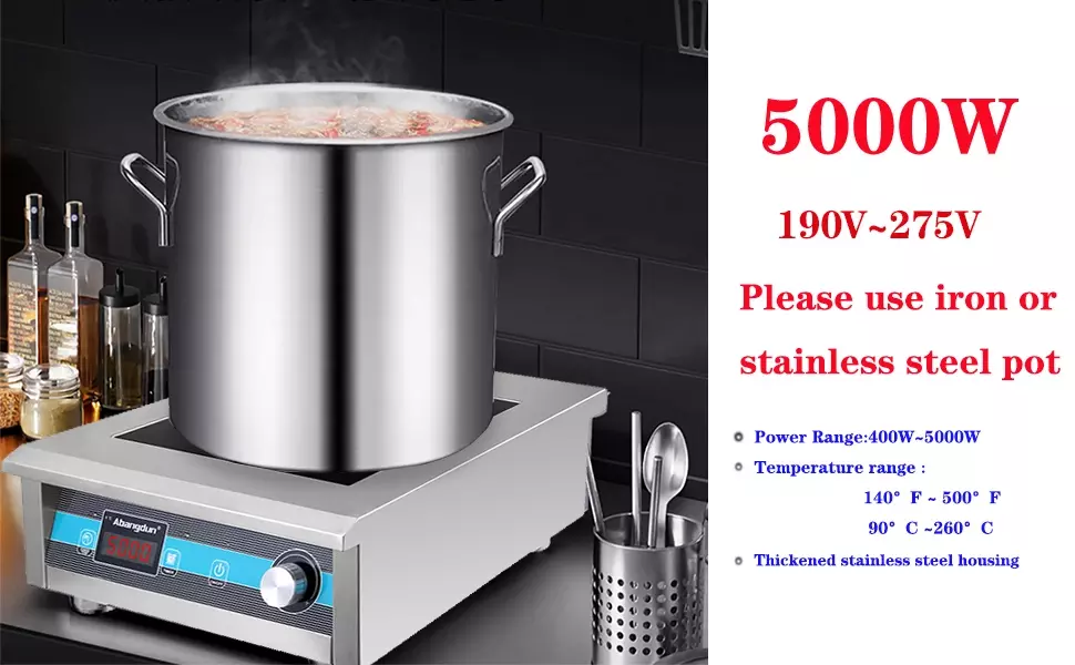 【FAST AND SAFE COOKING】:FCC approved.This extra-large commercial induction cooktop with max 5000W(240V) .The commercial induction cooktop is not cyclic/pulse working in low levels. and has a large coil, which has both a full power stage for fast heating and a low power stage for keeping warm.high rate heats faster than a normal electric burner, hot plate, oven or a cooktop stove.When the temperature is overheating or the pan is off the surface, the induction burner will stop working.
