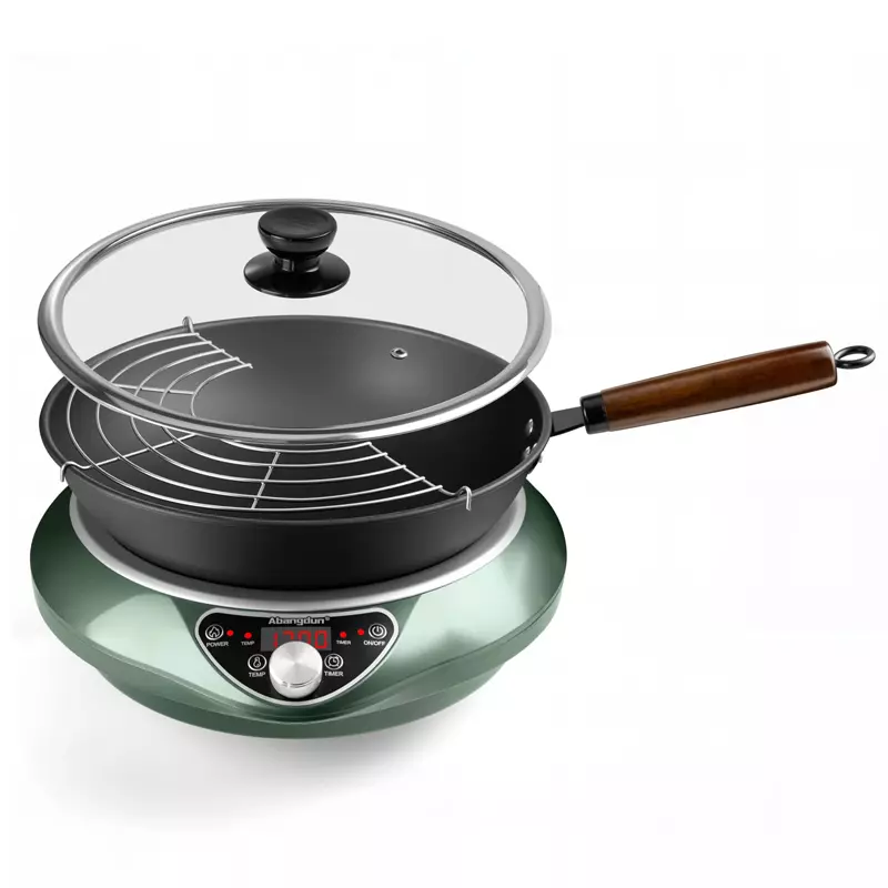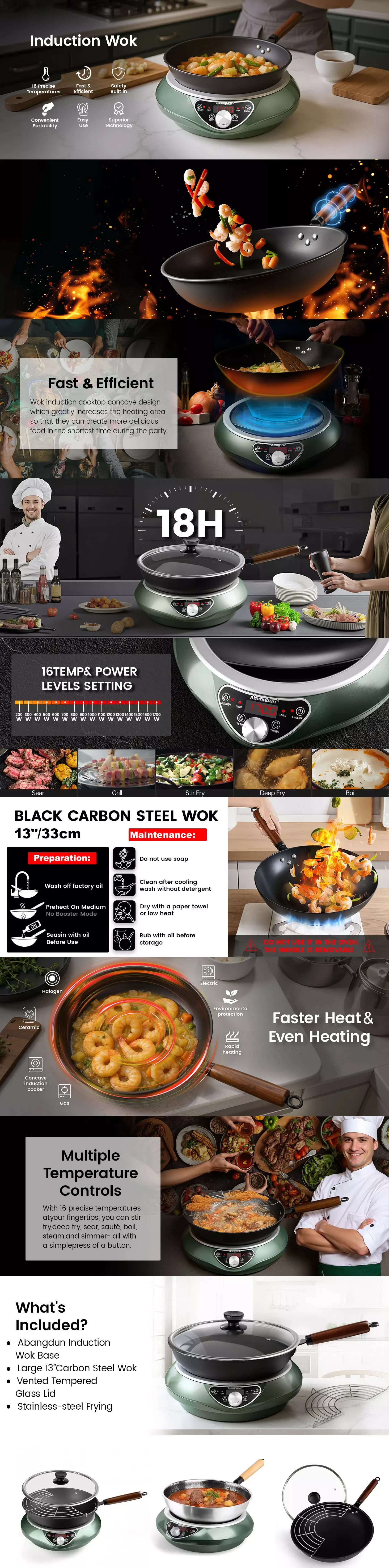 FRIENDLY REMINDER: This concave induction cooktop has a shallow curve, so it doesn’t require a perfect match with the wok’s curvature, as stir-frying involves tossing the wok. The concave coil ensures effective heating within a certain distance range, providing stable heat even if the wok’s curve isn’t exact. It is also compatible with flat-bottom pans with a diameter smaller than 9 inches.