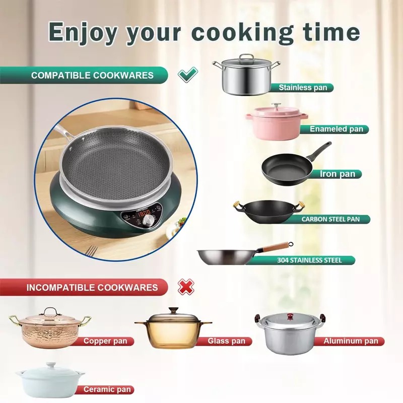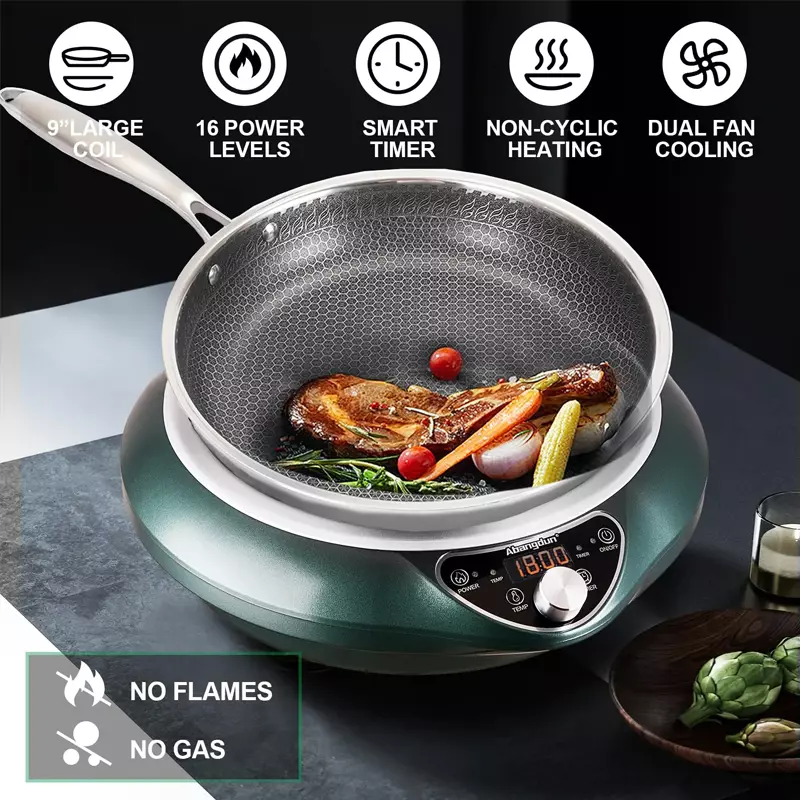【Flat Bottom Pan Induction Cooker for Cooking】: FCC Certified. The Abangdun 85V-175V Induction Cooktop is suitable for all North American households and commercial applications. Compared to traditional electric stoves, hot plates, and burners of the same power, induction cooktops are significantly more energy-efficient, saving time during cooking. Warning: Place cookware on the cooktop before turning on the induction cooker.Otherwise, it will display an E1 error.