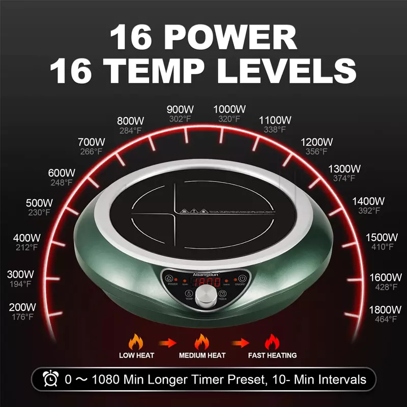 【Non-Cyclic/Pulsed Heating】: Unlike other induction burners on the market, Abangdun provides continuous and even heating at low power levels, eliminating the issue of intermittent cycling. This ensures more stable cooking performance, especially for dishes requiring long, low-temperature cooking.