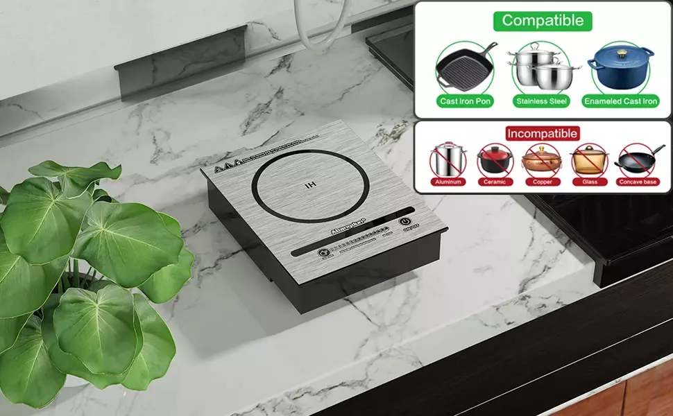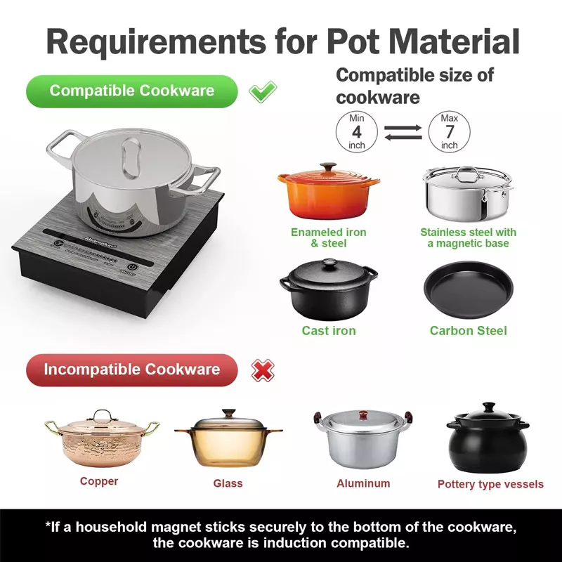 【Warning】: The max power of this small induction cooker is only 500W, so it can only be used for a small amount of cooking and is suitable for iron or stainless steel pans with a diameter of 3.9 inches to 6.5 inches.