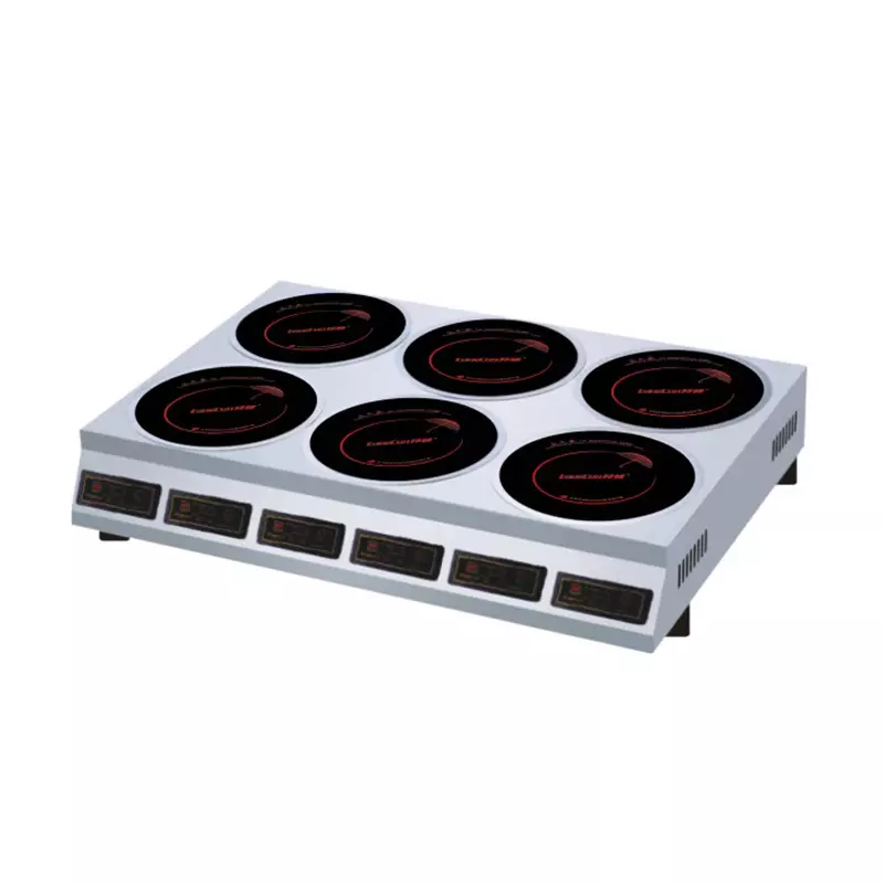 Commercial 6-Head Induction Cooker | 2000W–3500W Power Customizable | Button or Knob Control | Dual Size Options (39×29×6 / 44×32×6 Inches) | Stainless Steel Housing |
